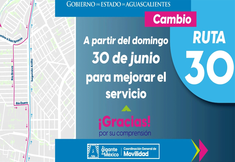 El Gobierno del Estado informa que a partir de este domingo 30 de junio la Ruta 30 cambiará su recorrido de manera permanente en el sentido de circulación de sur a norte, pues ya no recorrerá las calles del fraccionamiento Colinas del Río.