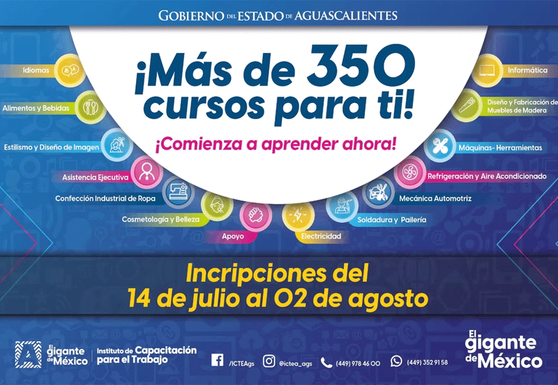 ¿Quieres mejorar tus oportunidades de empleo, aprender un nuevo idioma o prepararte en algún oficio? Esta es tu oportunidad, desde este 14 de julio y hasta el 2 de agosto, el Gobierno del Estado de Aguascalientes, a través del Instituto de Capacitación para el Trabajo del Estado de Aguascalientes (ICTEA), abre su periodo de inscripciones para más de 350 cursos prácticos y actualizados en áreas con alta demanda laboral.