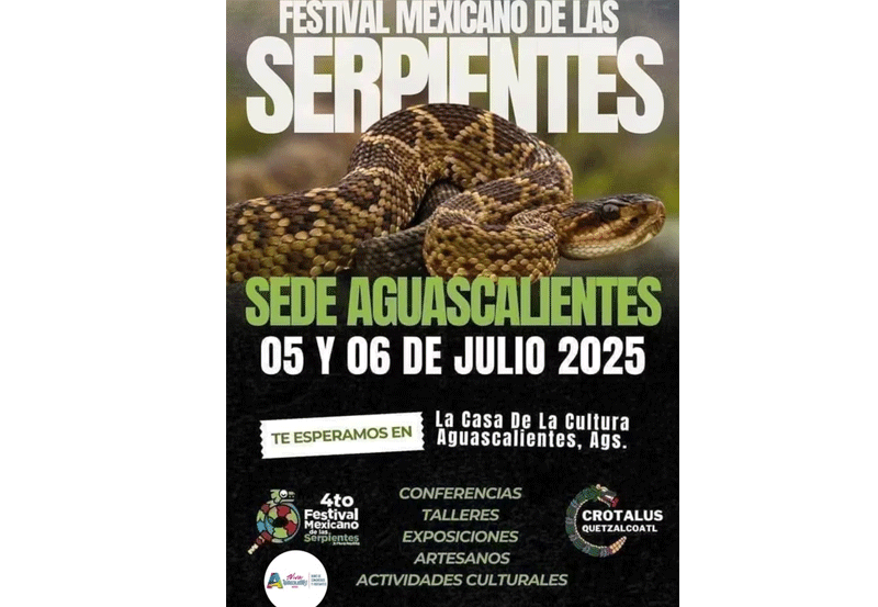 Aguascalientes será sede del 4.º Festival Mexicano de las Serpientes, que se llevará a cabo los días 5 y 6 de julio en la Casa de la Cultura de Aguascalientes. La entrada es gratuita y habrá actividades para toda la familia.