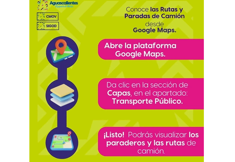 Ramiro Pedroza Márquez, titular de la Secretaría de Innovación y Gobierno Digital (Sigod), señaló que para visualizar las rutas y paraderos las personas deben ingresar a la aplicación móvil o la página web de Google Maps, dar clic en la sección de Capas y seleccionar el apartado de Transporte Público, de esta forma podrán ver en el mapa las diferentes rutas y paraderos que hay en la zona metropolitana.