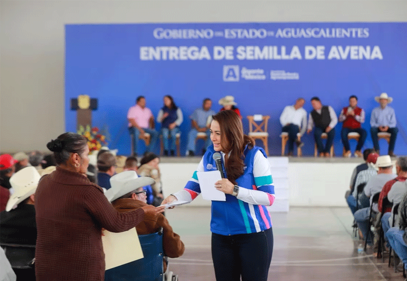 En el Auditorio Polivalente de Tepezalá, la gobernadora de Aguascalientes, Tere Jiménez, entregó semilla de avena a 2 mil productores de Rincón de Romos, Cosío, Pabellón de Arteaga, Tepezalá, Asientos, San José de Gracia, Jesús María y San Francisco de los Romo, con una inversión de 5 millones de pesos.