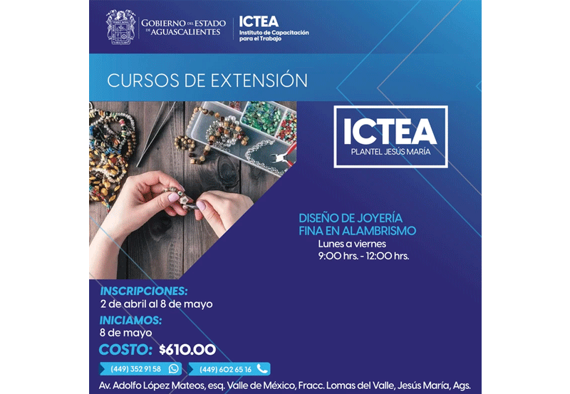 El Instituto de Capacitación para el Trabajo del Estado de Aguascalientes (ICTEA) te invita a participar en los diferentes cursos que imparte como: gastronomía, corte y confección; cosmetología y belleza; asistencia ejecutiva e informática; inglés, francés, japonés y alemán; electricidad, electrónica, máquinas-herramientas, mecánica automotriz, manejo de montacargas, refrigeración, aire acondicionado, carpintería y soldadura.
