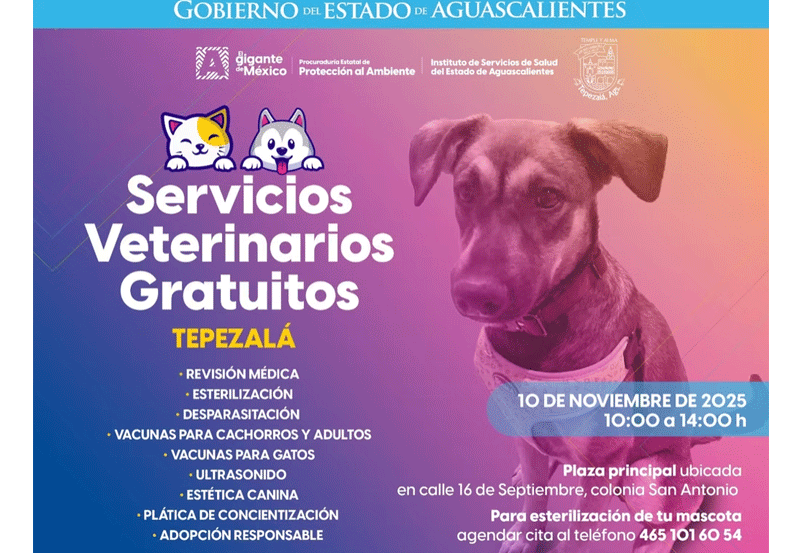 En Tepezalá, la brigada se realizará el lunes 10 de noviembre de 10:00 a 14:00 horas en la plaza principal. Para esterilizaciones, agenda tu cita al 465 101 60 54.