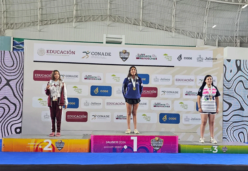 Durante las competencias en el estado de Jalisco, Sara Abigail Martínez Ortiz se llevó la medalla de oro en la disciplina de natación, al alcanzar el primer lugar en la prueba de 1,500 metros libres, en la categoría de 13 a 14 años. Su esfuerzo y dedicación la llevaron a lo más alto del podio, con lo que demostró el talento y la preparación de los deportistas hidrocálidos.