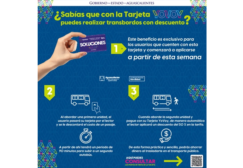 Para aprovechar este descuento, válido en todas las rutas, es necesario contar con la tarjeta YoVoy, que además de los transbordos tiene otras ventajas, como mayor agilidad al abordar los camiones y una tarifa más económica; quienes aún no la tengan pueden adquirirla en establecimientos autorizados así como en el módulo de la CMOV que se instala los Jueves de Bolsa de Trabajo, en esta ocasión en FICOTRECE y posteriormente cada jueves en Palacio de Gobierno. El costo es de 35 pesos, e incluye un pasaje.