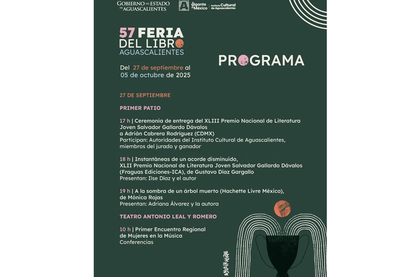 El Instituto Cultural de Aguascalientes (ICA) dio a conocer el programa de la 57 Feria del Libro Aguascalientes 2025, que se realizará del sábado 27 de septiembre al domingo 5 de octubre en la Casa de la Cultura Víctor Sandoval, en la capital, bajo el lema “Mente sana, libro en mano”.