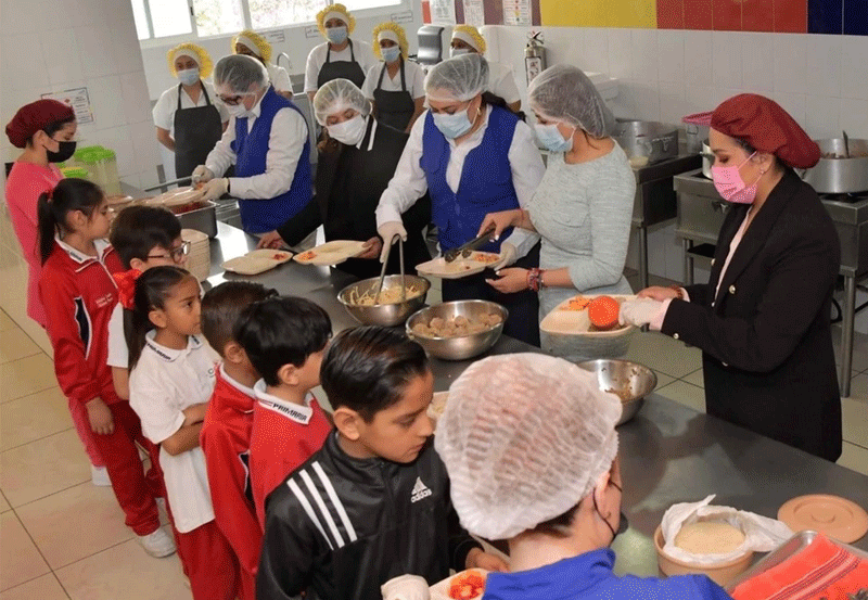 La gobernadora Tere Jiménez impulsa el Programa de Desayunos Escolares Calientes y Fríos, a través del cual se beneficia mensualmente a 26 mil 750 niñas, niños y jóvenes de 550 planteles educativos, desde nivel preescolar hasta nivel superior, ello con el objetivo de garantizar el desarrollo integral de las y los estudiantes de Aguascalientes.