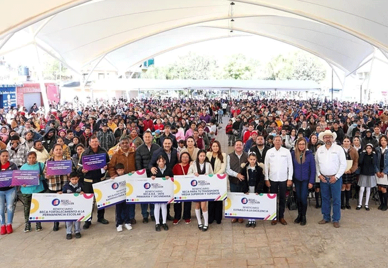 En la comunidad de Villa Juárez, la gobernadora hizo entrega de alrededor de mil 500 becas académicas a niñas, niños y jóvenes para que puedan continuar sus estudios y apoyar la economía de sus familias.