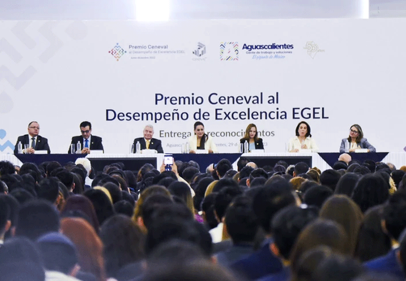 La gobernadora de Aguascalientes, Tere Jiménez, encabezó la ceremonia del Premio Ceneval al Desempeño de Excelencia-EGEL, donde se entregaron galardones a 4 mil 789 egresados de 182 universidades públicas y privadas de todo el país que se dieron cita en el Gigante de México.
