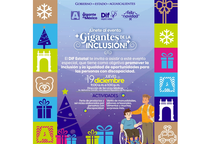 El Sistema DIF Estatal invita a la población a asistir este jueves 19 de noviembre al evento “Gigantes de la Inclusión”, en el que personas con discapacidad ofrecerán una gran variedad de productos, como manualidades, jabones artesanales, alimentos, entre otros.