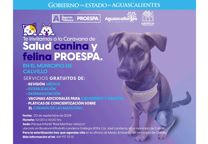 El Gobierno del Estado invita a las y los propietarios de mascotas a la Caravana de Salud Canina y Felina este próximo viernes 20 de septiembre en el municipio de Calvillo.