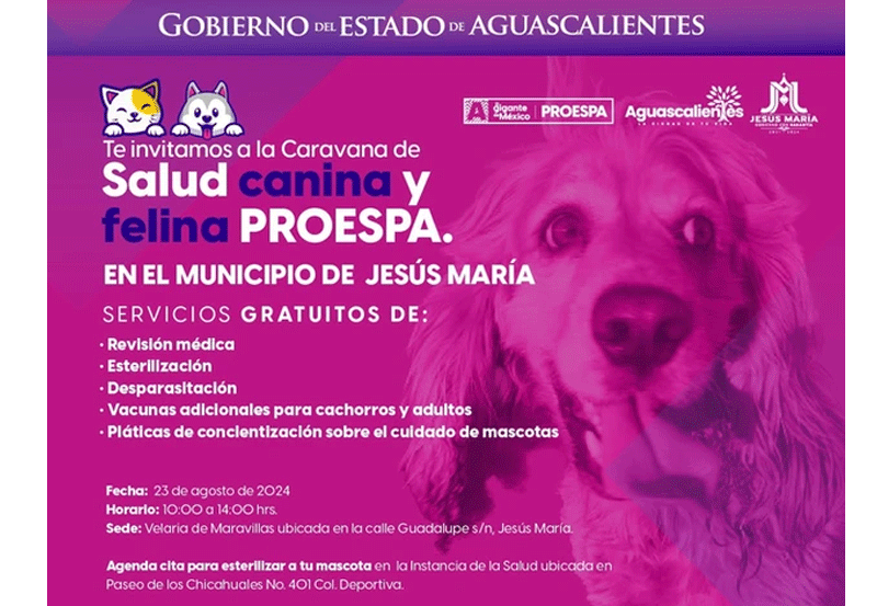 Con el firme propósito de fomentar el cuidado y la protección de los animales, el Gobierno del Estado invita a las y los propietarios de mascotas a participar en la Caravana de Salud Canina y Felina, que se llevará a cabo este viernes 23 de agosto en en la comunidad de Maravillas en el municipio de Jesús María.