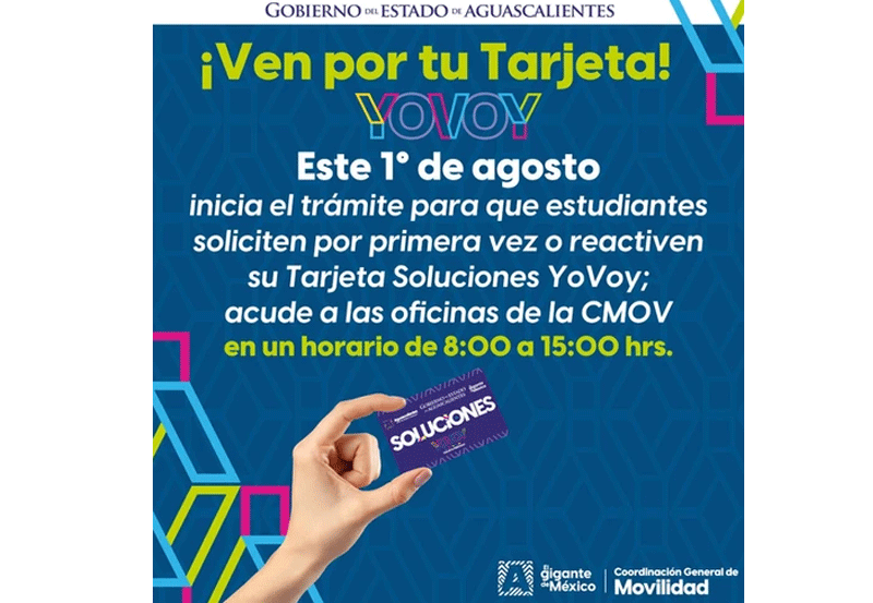 El Gobierno del Estado de Aguascalientes informa que desde agosto y hasta el mes de octubre, estudiantes de la entidad podrán realizar el trámite para obtener la Tarjeta Soluciones YoVoy, con la que podrán acceder a tarifas preferenciales en el transporte urbano.