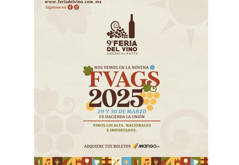El Gobierno del Estado de Aguascalientes, a través de la Secretaría de Turismo (Sectur), invita a la 9.ª Feria del Vino Aguascalientes, que se llevará a cabo los días 29 y 30 de marzo de las 13:00 a 21:00 horas en la Ex Hacienda La Unión, ubicada en San Francisco de los Romo.