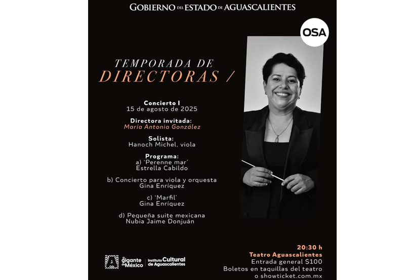 El Instituto Cultural de Aguascalientes (ICA) invita al primer concierto de la Temporada de Directoras con la Orquesta Sinfónica de Aguascalientes (OSA), que se llevará a cabo el viernes 15 de agosto a las 20:30 horas en el Teatro Aguascalientes.