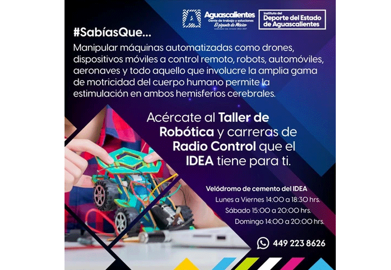 El Instituto del Deporte del Estado de Aguascalientes (IDEA) invita a toda la población a participar de forma gratuita en el Taller de Robótica y Carreras de Radio Control.
