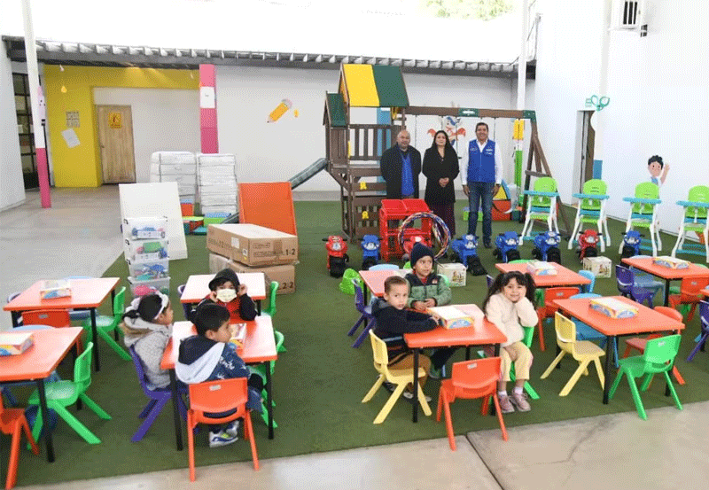 El equipamiento incluye material didáctico, mobiliario, electrodomésticos, equipo de cocina y línea blanca, juegos infantiles, así como artículos de seguridad e higiene, todo ello con el propósito de fortalecer la atención integral que reciben los pequeños en su día a día.