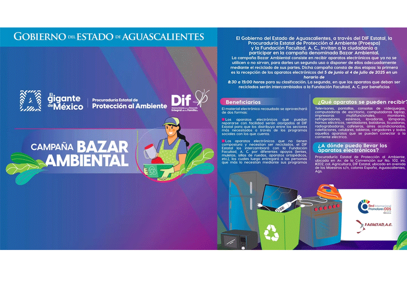 El Sistema para el Desarrollo Integral de la Familia (DIF) Estatal, en conjunto con la Procuraduría Estatal de Protección al Ambiente (Proespa) y la Fundación Facultad A. C., invita a toda la población a participar en el Bazar Ambiental, una iniciativa que transforma residuos electrónicos en esperanza para quienes más lo necesitan.