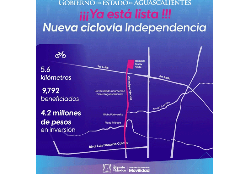 La Ciclovía Independencia cubre un tramo de 2.8 kilómetros por sentido, entre el bulevar Luis Donaldo Colosio y la Terminal YoVoy Norte, cerca del Tercer Anillo. Esta vía ciclista ya está en funcionamiento y forma parte del compromiso estatal con la movilidad sustentable.