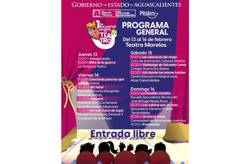 El Instituto Cultural de Aguascalientes (ICA) invita a las familias a disfrutar gratis del Primer Encuentro Estatal de Teatro Infantil que se llevará a cabo del 13 al 16 de febrero en el Teatro Morelos.