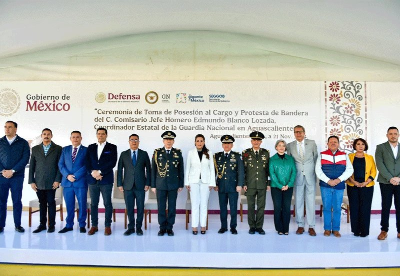 La gobernadora Tere Jiménez asistió a la Toma de Posesión y Protesta de Bandera del nuevo coordinador estatal de la Guardia Nacional en Aguascalientes, Homero Edmundo Blanco Lozada, a quien reiteró el compromiso del Gobierno del Estado de continuar trabajando en coordinación con las instituciones federales para garantizar la paz y la tranquilidad en esta entidad.