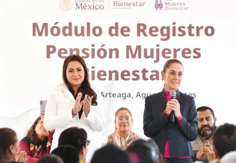 Inicialmente, Tere Jiménez y Claudia Sheinbaum visitaron la cabecera municipal de Pabellón de Arteaga, donde conocieron los avances en el registro del programa Mujeres Bienestar que promueve el Gobierno Federal.