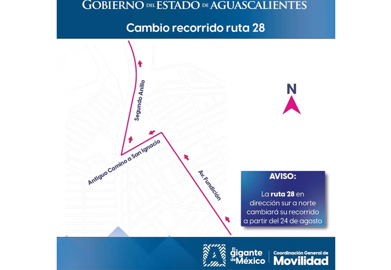 La Coordinación General de Movilidad informa que, a partir del domingo 24 de agosto, la ruta 28 del transporte público cambiará su recorrido en dirección de sur a norte.