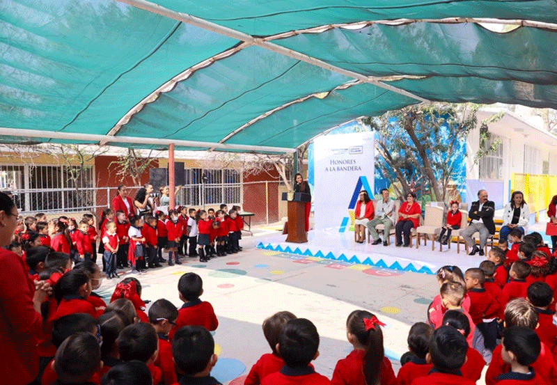 Al rendir honores a la bandera en el preescolar “Joaquín Fernández de Lizardi” en la colonia Loma Bonita, la gobernadora de Aguascalientes, Tere Jiménez, entregó un nuevo módulo de sanitarios para que las y los pequeños cuenten con espacios dignos.