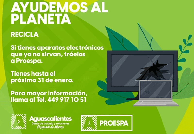 Con el propósito de contribuir al cuidado del planeta, la Procuraduría Estatal de Protección al Ambiente (Proespa) invita a la población a llevar aparatos electrónicos que ya no utilicen o no sirvan a sus instalaciones, la fecha límite es hasta el 31 de enero de 2024.
