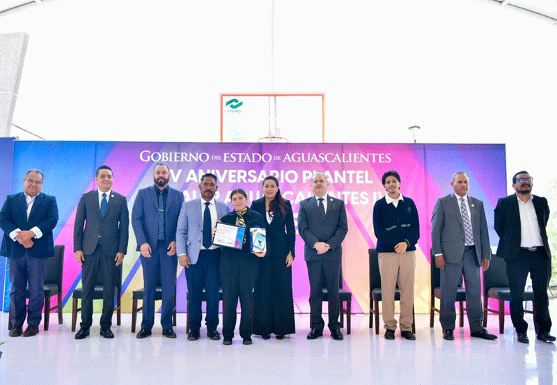 La gobernadora Tere Jiménez encabezó la celebración del XV Aniversario del plantel Conalep Aguascalientes IV en Lomas del Mirador, donde develó una placa conmemorativa y felicitó a la comunidad de esta institución educativa, además de conocer las instalaciones del moderno laboratorio de Agrotecnología, un espacio clave para la formación técnica en el sector agroindustrial del estado.