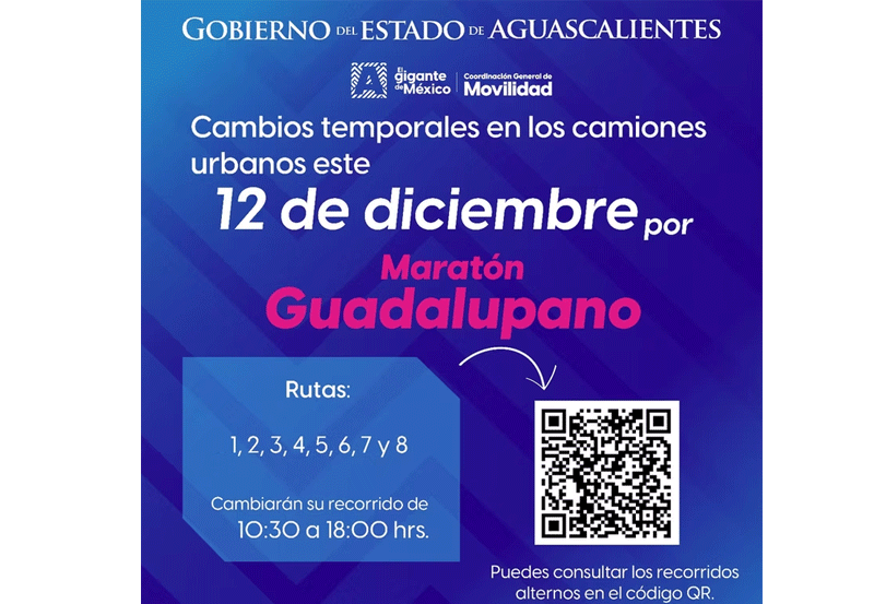 Debido al Maratón Guadalupano que se realizará el viernes 12 de diciembre, algunas rutas de camiones urbanos realizarán cambios temporales en su recorrido.