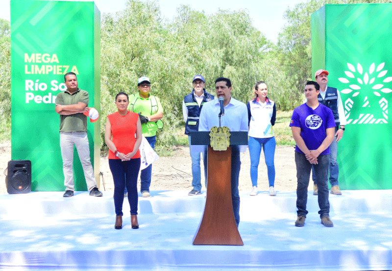 Durante el evento que se realizó en la zona del río San Pedro a la altura de la colonia Curtidores en la ciudad capital, Tere Jiménez también encabezó una megalimpieza en las márgenes de este afluente, en la que participaron servidores públicos del Gobierno del Estado y de la Presidencia Municipal de Aguascalientes, así como empresarios, estudiantes y organizaciones de la sociedad civil; con esta acción se dio inicio oficial al proyecto de rehabilitación integral para la recuperación y saneamiento del río San Pedro.